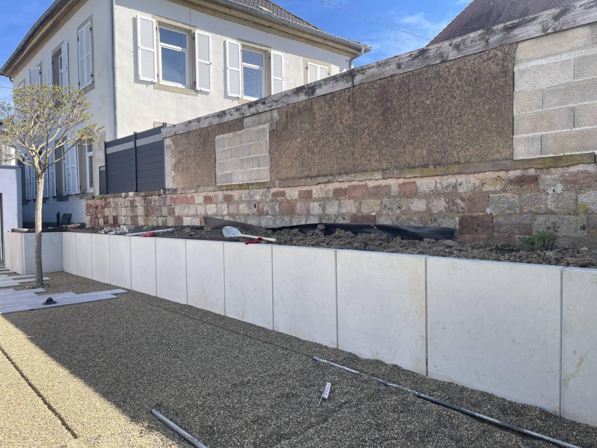 - Installation de murs de soutènement en béton lisse, garantissant une parfaite intégration et une structure solide.